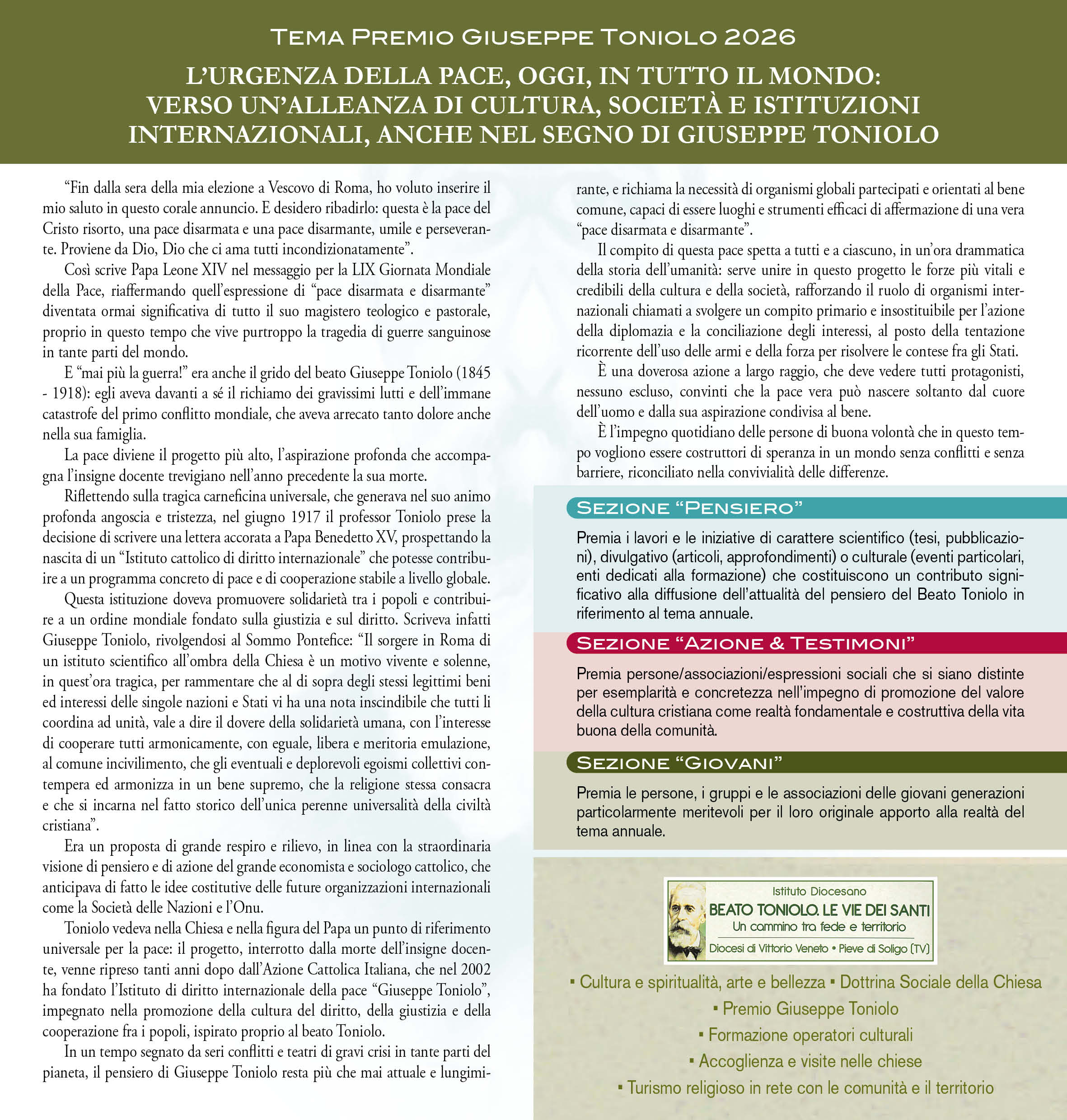 Tema di questa edizione: L’urgenza della pace, oggi, in tutto il mondo: verso un’alleanza di cultura, società e istituzioni internazionali, anche nel segno di Giuseppe Toniolo.