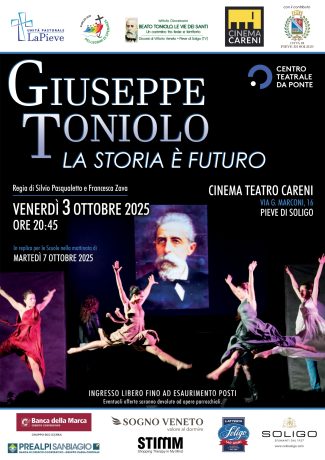 Lo spettacolo teatrale “Giuseppe Toniolo. La storia è futuro” è la riproposta, aggiornata e rimodulata in alcuni passaggi di testi e scenografie, dell’omonima piece in prosa, musiche e balletti andata in scena per la prima volta ad aprile 2018 al teatro Careni di Pieve di Soligo, nell’ambito delle celebrazioni per il centenario della morte del beato Giuseppe Toniolo (1845 – 1918).